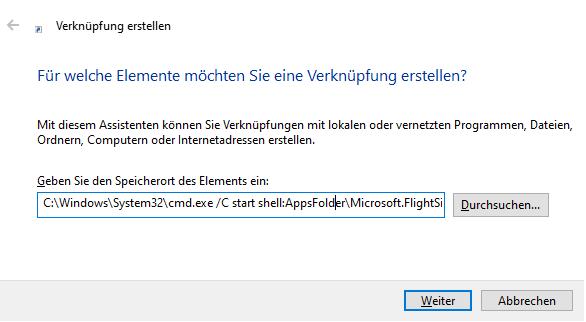 Im nächsten Fenster wird dann nach einem Namen für die Verknüpfung gefragt. Vermutlich wird "cmd.exe" vorgegeben sein. Aber das ist wenige zielführend. Tragt da lieber sowas eine wie "MSFS-FL" oder sowas. Klickt dann auf "Fertigstellen".